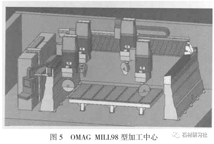 由于有關技術和關鍵的問題還未得到完全徹底解決,故在國内石材加工中還沒得到廣泛應用,也顯著提高了石材制品的加工效率。圖5爲意大利OMAG公司的MILL98型加工中心工作模拟圖,該加工中心同時配備了4個工作頭。