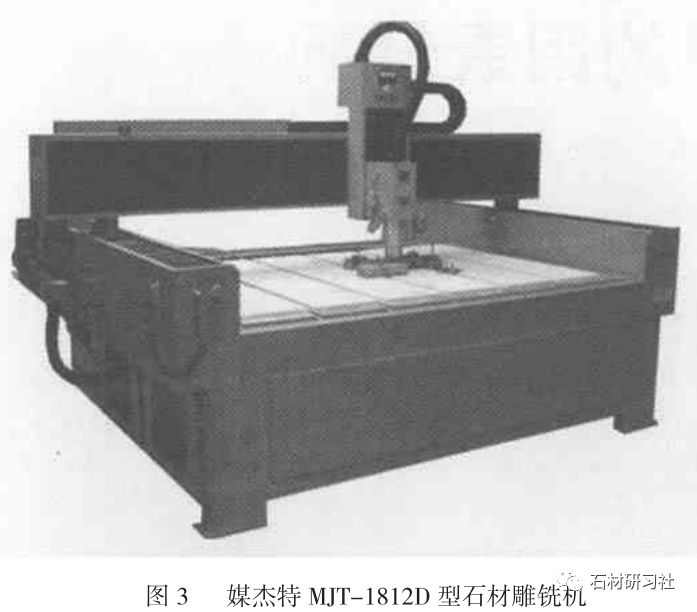 圖3爲國産美傑特MJT-1812D型石材雕銑機主 要用于墓碑加工,其最大加工尺寸爲:寬2700mm、 長2100mm、高1800mm,最大加工質量爲: 1500kg。